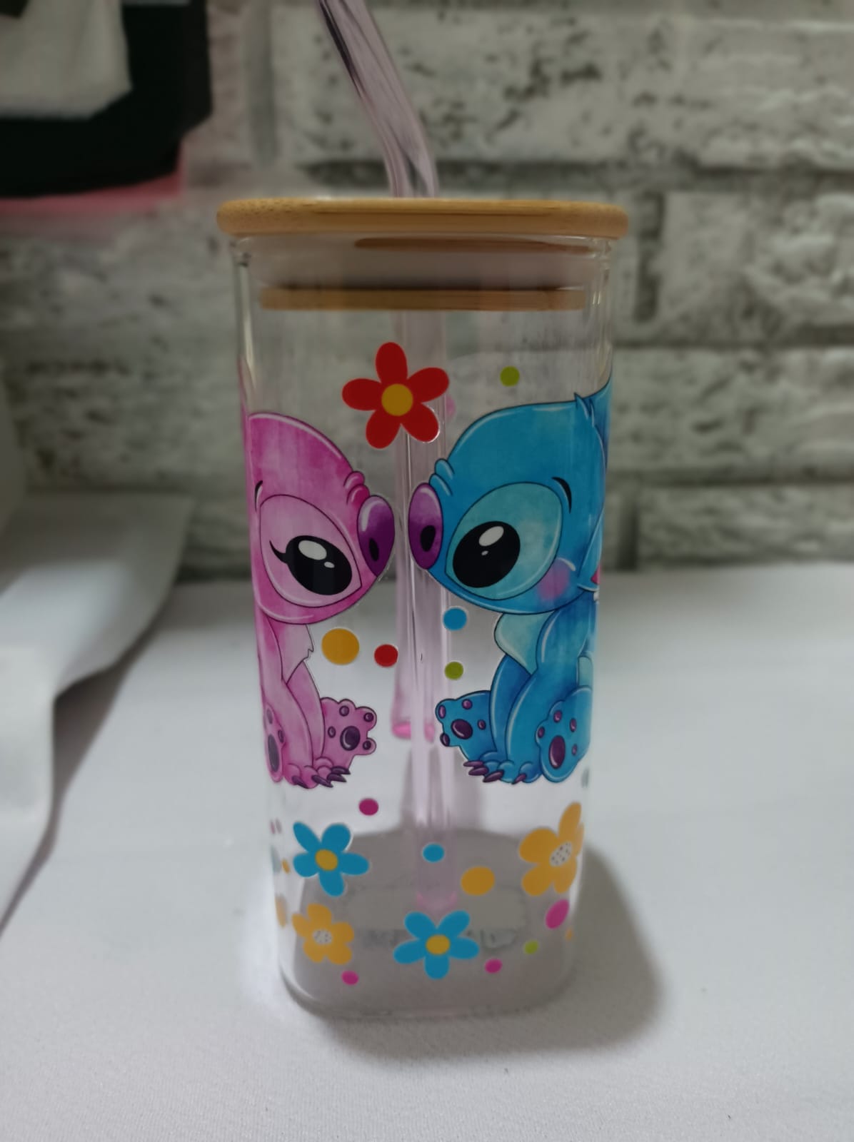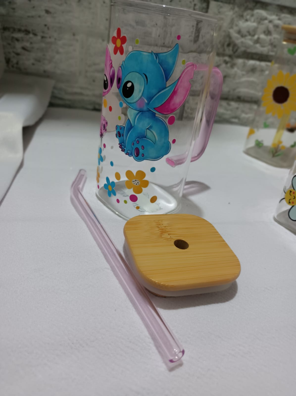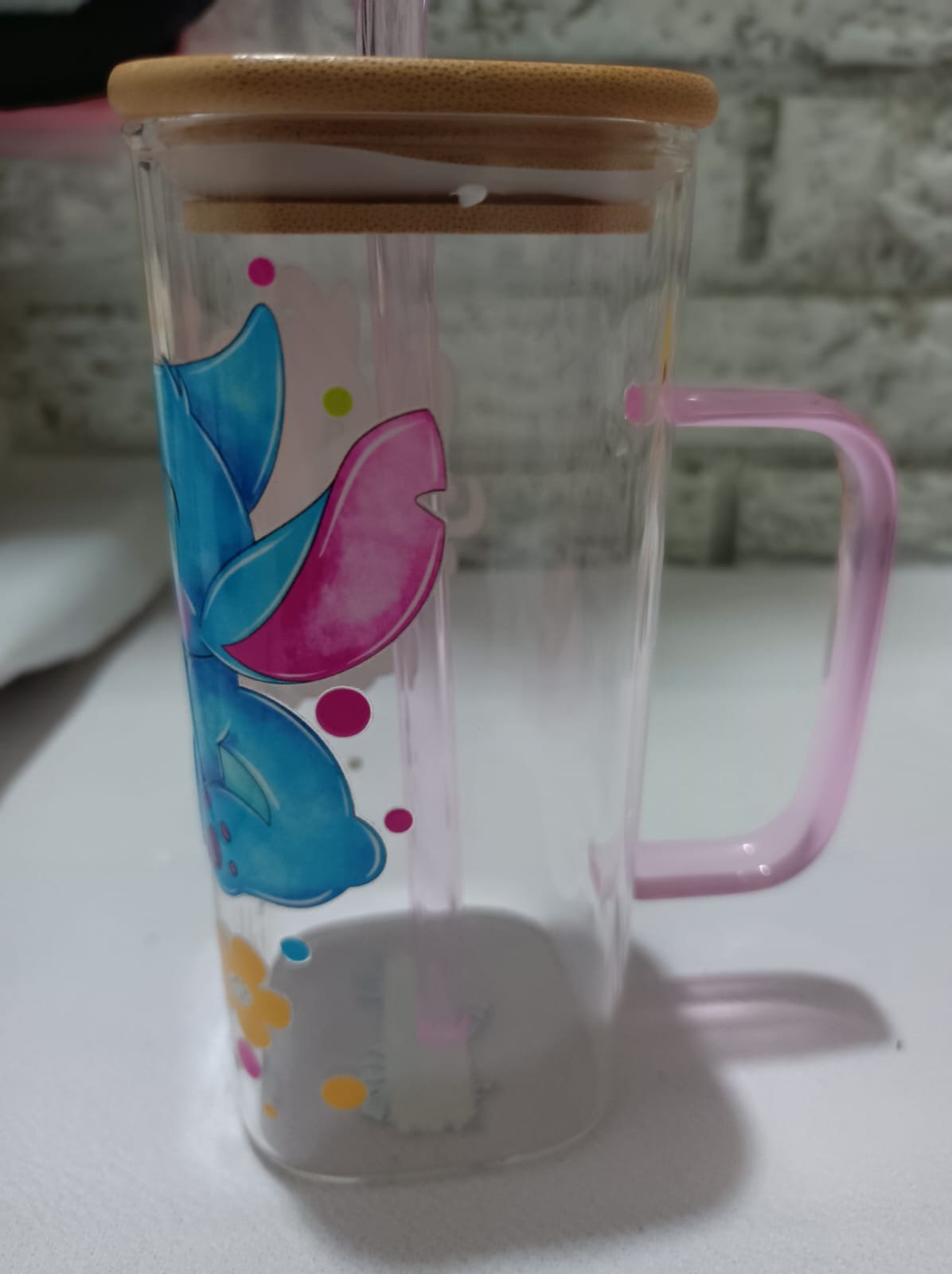 Taza 400 ml con asa de color , Tapadera de bambú y pajilla de color material vidrio.-