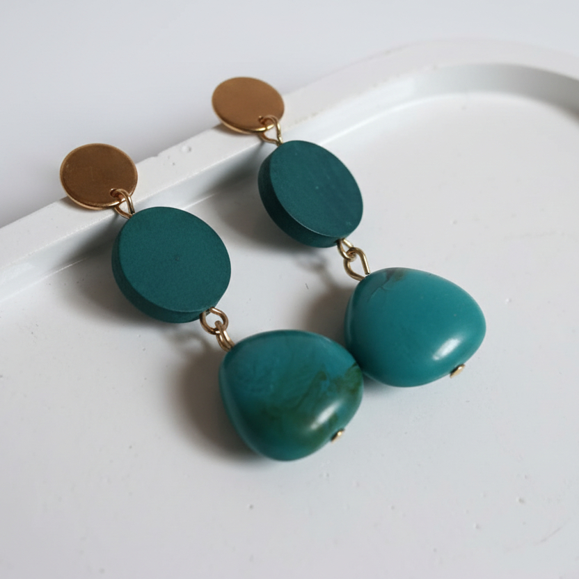 Aretes colgantes de madera pintados a mano, montados en acero inoxidable de alta calidad. Cada pieza es única, con detalles artesanales que reflejan cuidado y creatividad. El acero inoxidable garantiza durabilidad y resistencia a la corrosión, mientras que la madera pintada añade calidez y personalidad a tu look. Hipoalergénicos e ideales para pieles sensibles, son cómodos para usar todo el día. Perfectos para quienes buscan accesorios con estilo bohemio y toque hecho a mano que combinen con cualquier atuendo.
