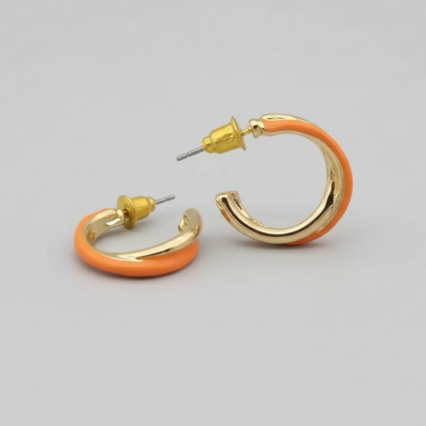 Arete media argolla en acero inoxidable con acabado naranja y dorado que combina elegancia bohemia con versatilidad moderna. Fabricado en acero inoxidable de alta calidad, resiste la corrosión y es ideal para pieles sensibles. Su diseño circular minimalista se adapta perfectamente al uso diario, ofreciendo durabilidad y estilo sin compromisos. Un accesorio sofisticado que realza cualquier look con refinamiento y sencillez..