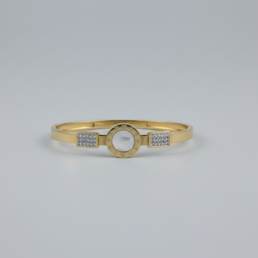 Pulsera doble reloj romano de acero inoxidable con baño en oro 18k y detalles brillantes que capturan la luz con elegancia. Su diseño geométrico sofisticado ofrece resistencia y comodidad para uso diario sin comprometer el brillo. Correa ajustable que se adapta perfectamente a cualquier muñeca. Versátil y atemporal, complementa tanto looks casuales como formales, permitiéndote expresar tu estilo personal. Una pieza refinada que destaca sola o se combina beautifully con otros accesorios.