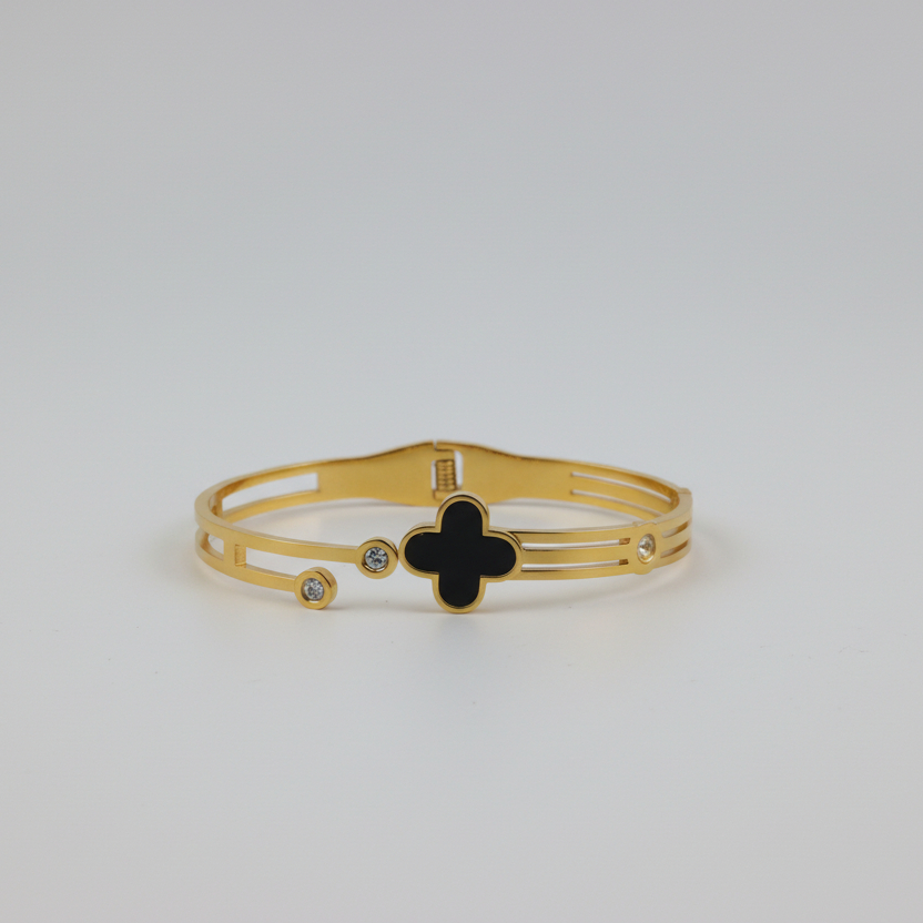 Pulsera de trébol en acero inoxidable con baño de oro 18k que resplandece con elegancia atemporal. Su diseño ajustable se adapta perfectamente a cualquier muñeca, ideal para el día a día o eventos especiales. Resistente y duradero, mantiene su brillo sin necesidad de mantenimiento constante. Esta pieza versátil complementa tanto looks casuales como formales, añadiendo un toque de sofisticación a tu estilo personal. Un accesorio confiable que trasciende las tendencias..