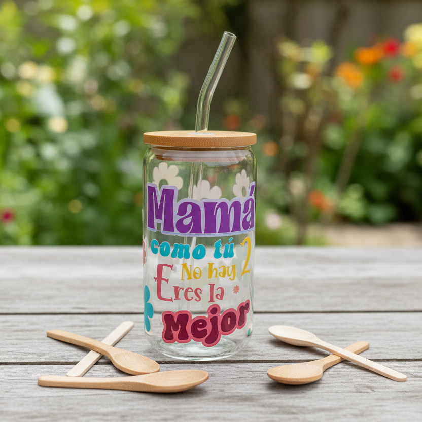 Vaso vidrio 16onz con diseño , tapa bambú y pajilla de vidrio.