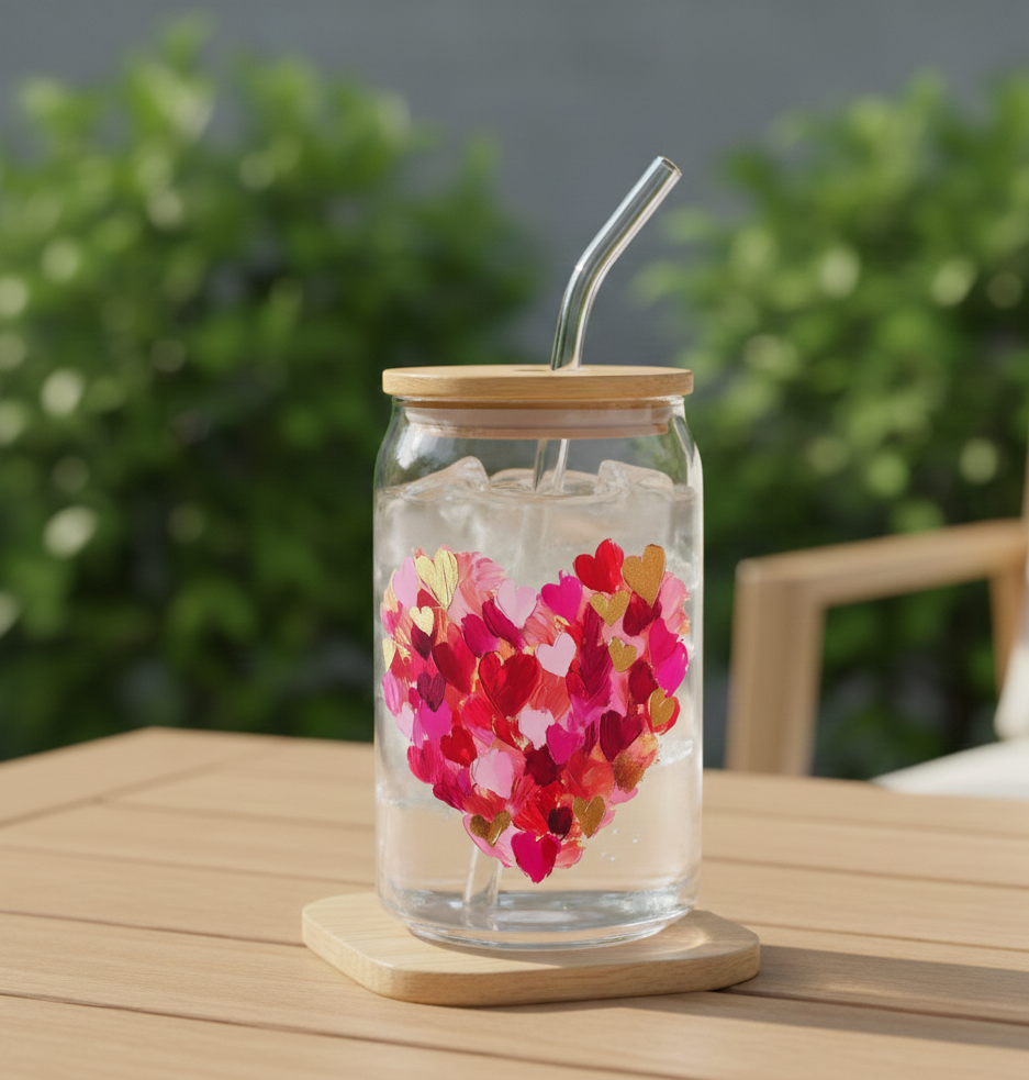 Vaso de vidrio con su tapadera de bambú ecológico y pajilla de vidrio, con un diseño lleno de amor y colores hermosos, 16 onz y diseño colorido.